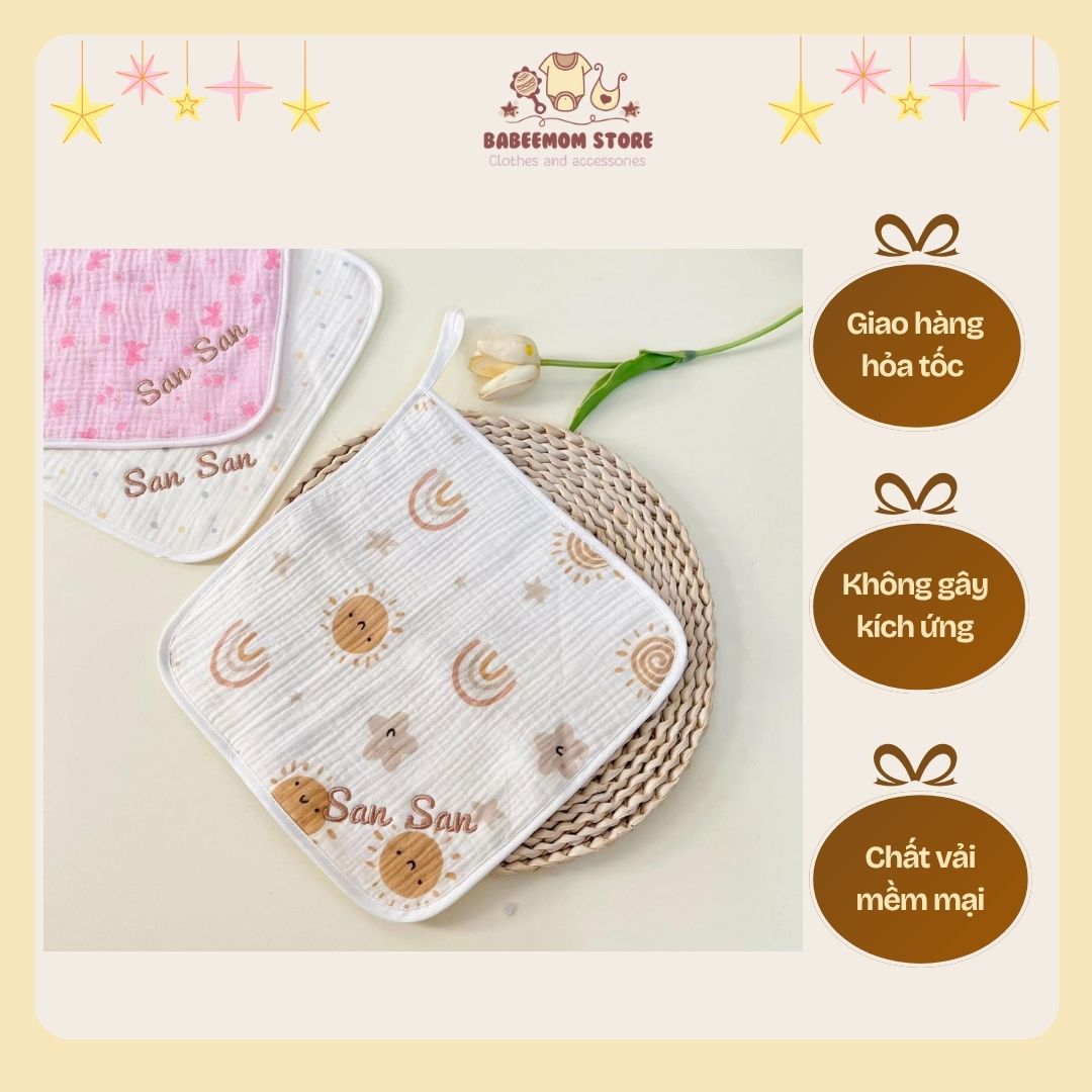 - Thêu Tên Riêng: Tên của bé được thêu tinh tế tại [Ví dụ: góc khăn/mũ khăn] bằng kỹ thuật Thêu Vi Tính chuyên nghiệp. Đường thêu chắc chắn, chỉ thêu [Ví dụ: cotton/tơ] mềm mại, không làm cộm da bé.